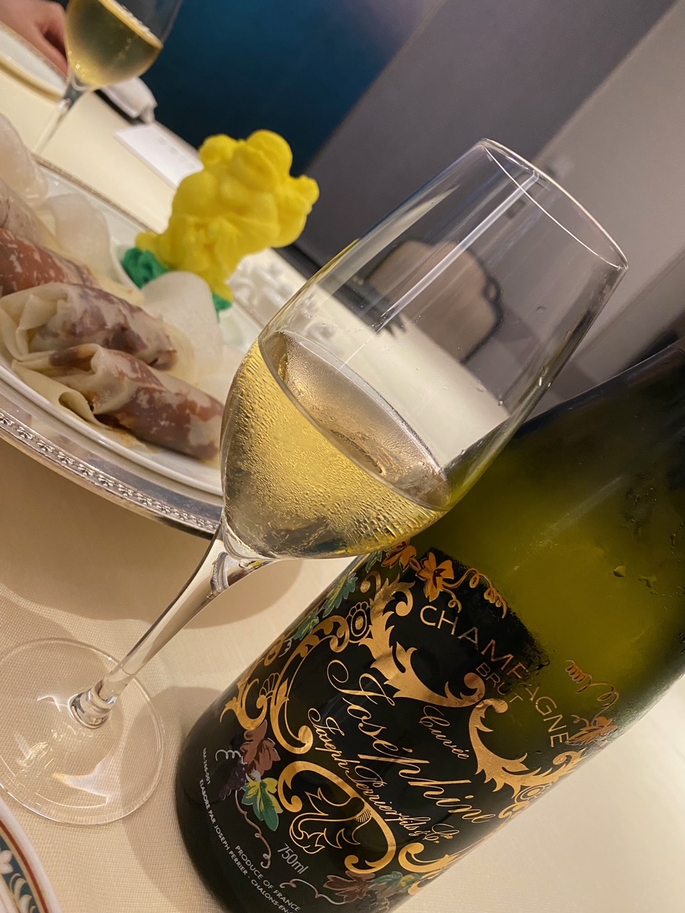 そのプレステージであるジョセフィーヌはラベルも華やかで印象的だ。小さな泡は溶け込んでいる。熟成によるスパイス香、ハチミツが香る。アタックから中盤にかけてもしなやかで優しい。ほのかなミネラル感からくる質感とともに料理に自然と寄り添ってくれる。「前菜の盛り合わせ」「北京ダック」「ふかひれスープ」など中華らしい素直な美味しさと共に楽しむ。
