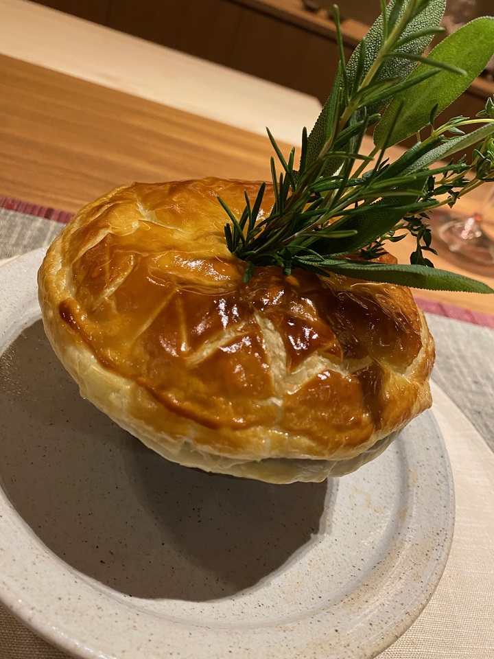 美しく焼きあがったパイの真ん中にはハーブのブーケが刺してある。それを前に吉越シェフは急須を手にし、ハーブの穴からスープをたっぷり注いで完成だ。新鮮なハーブの香る中パイを崩し入れながらホクホク頂く。