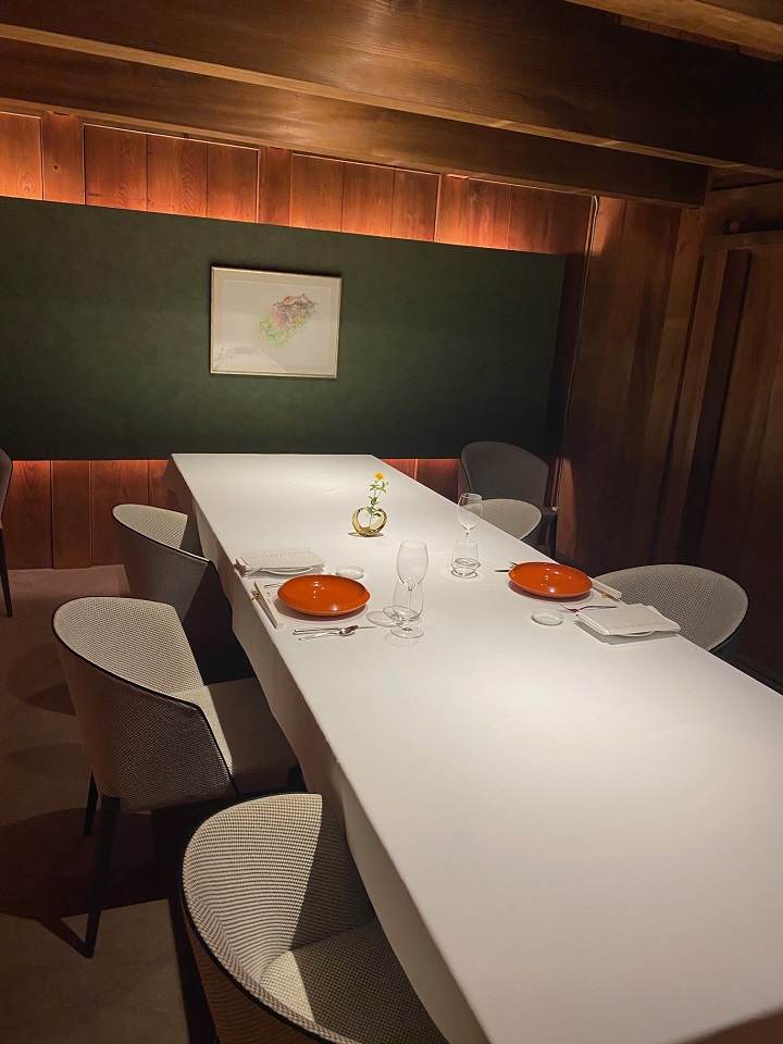 前回に続いて、京都フレンチ「モトイ(Restaurant MOTOI)」のディナー後半。大正時代の日本家屋を再生した和モダンな空間で、前田元シェフの独特の世界観が楽しめるレストランだ。梁が印象的な天井高の広いダイニング、奥に見える中庭は灯籠や苔むした庭石がライトアップされ風情ある。初秋の風が心地よいこの夜は、その庭の奥にある「蔵」を改装した個室(特別室)で「特別室限定メニュー」を頂いた。