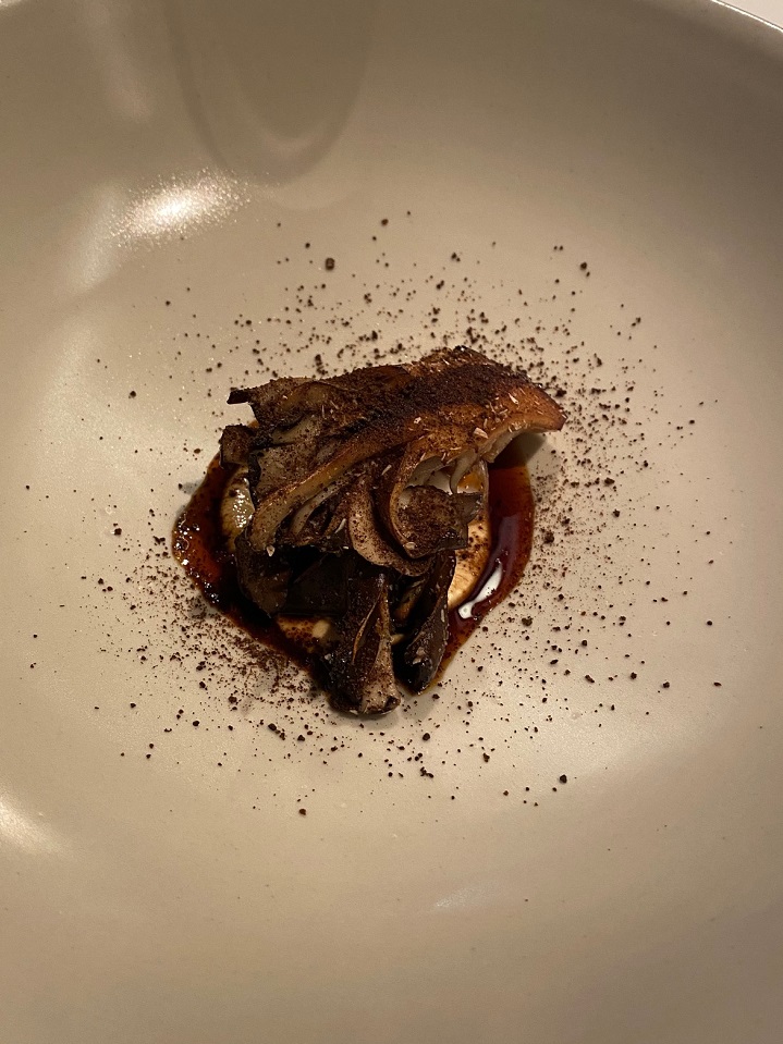まさに肉のようなジュージーな肉厚のキノコ。コンソメのスープに松の実のペーストを合わせた。ポルチーニのパウダーが振られて、デザイン的にも味わい的にもアクセントになっている。これはもう何とも美味!「料理に使えるのは一部なので、賄い料理は舞茸ご飯が最近の定番です」と笑顔の若林ソムリエ。「皆さんに満足度高いと言って頂いてます」と言うだけある見事な完成度であった。